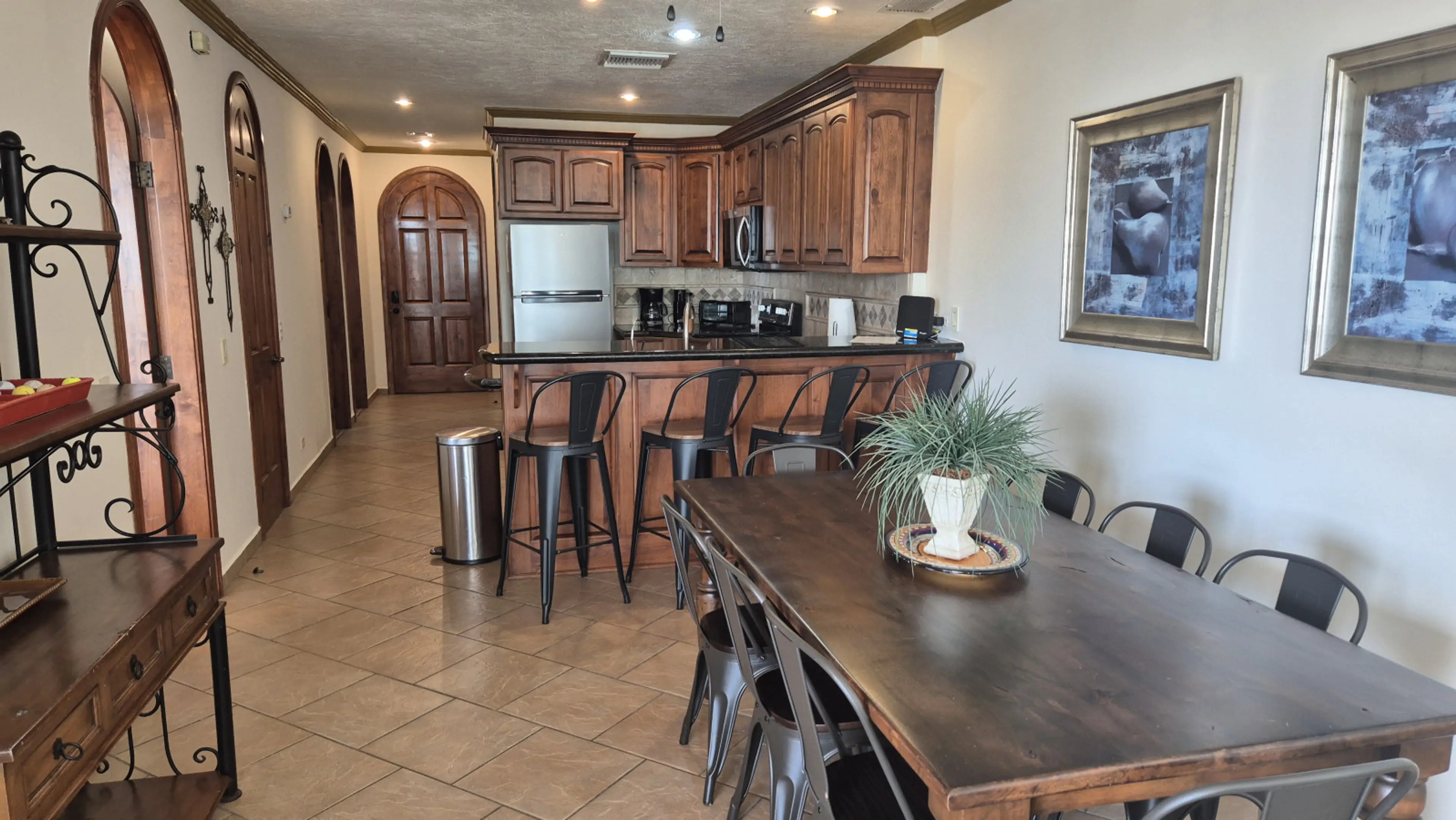 We're frequent visitors to Rocky Point but have never taken our dogs before. We chose Casa Blanca because it is pet friendly. Wanted to take our dogs. We specifically chose to do this in January when it's cold and we would be in the condo most of the time. We enjoyed having a king size bed in both bedrooms however there are no TVs in either of the bedrooms. The TV in the living room doesn't work much. I contacted the host who told me to turn on the Blu-ray player and follow the menu options for streaming services. It did take me to Netflix, but that's it. literally no other TV options available. When I contacted the host a second time to tell him that I could not get the TV to work properly he stopped responding to me. The furniture both inside the condo and out on the patio are in need of repair. The wall in the guest bathroom looks like it either has holes, or mold, or maybe both. The table on the balcony is completely broken and falling apart. The cooking sheet inside of the toaster oven was so dirty and rusted out that I had to take it out and put my food directly on the heating rack. The table in the living room is unstable. If you rest anything on it, it wobbles. I took pictures of everything. The listing says it's a short walk to the beach. I disagree, it is not a short walk. The private Wi-Fi worked very well. The views of the ocean are pretty. The bedding in both bedrooms was very good quality.